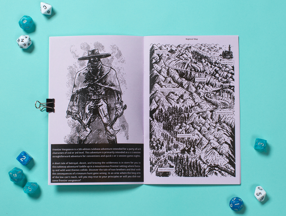 Frontier Vengeance is a 5th edition rulebase adventure intended for a party of 4-6 characters of 2nd or 3rd level. This adventure is primarily intended as a 1-2 session straightforward adventure for conventions and quick 1 or 2 session game nights.