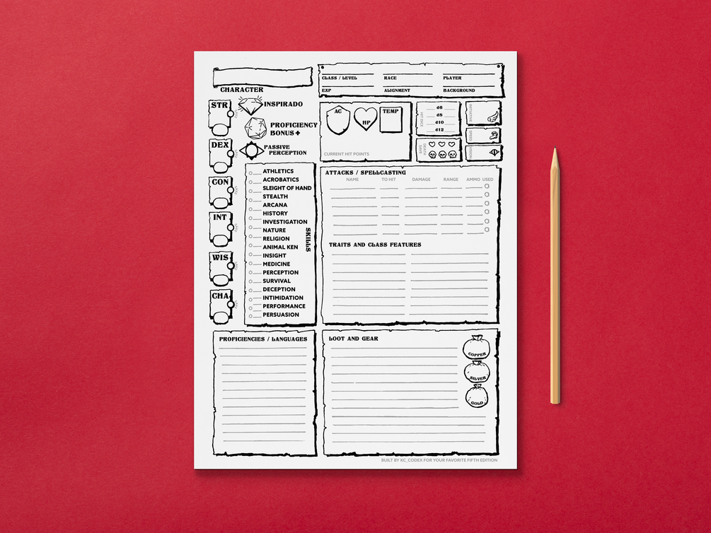 5th Edition Hand Drawn Character Sheet by KC_Codex