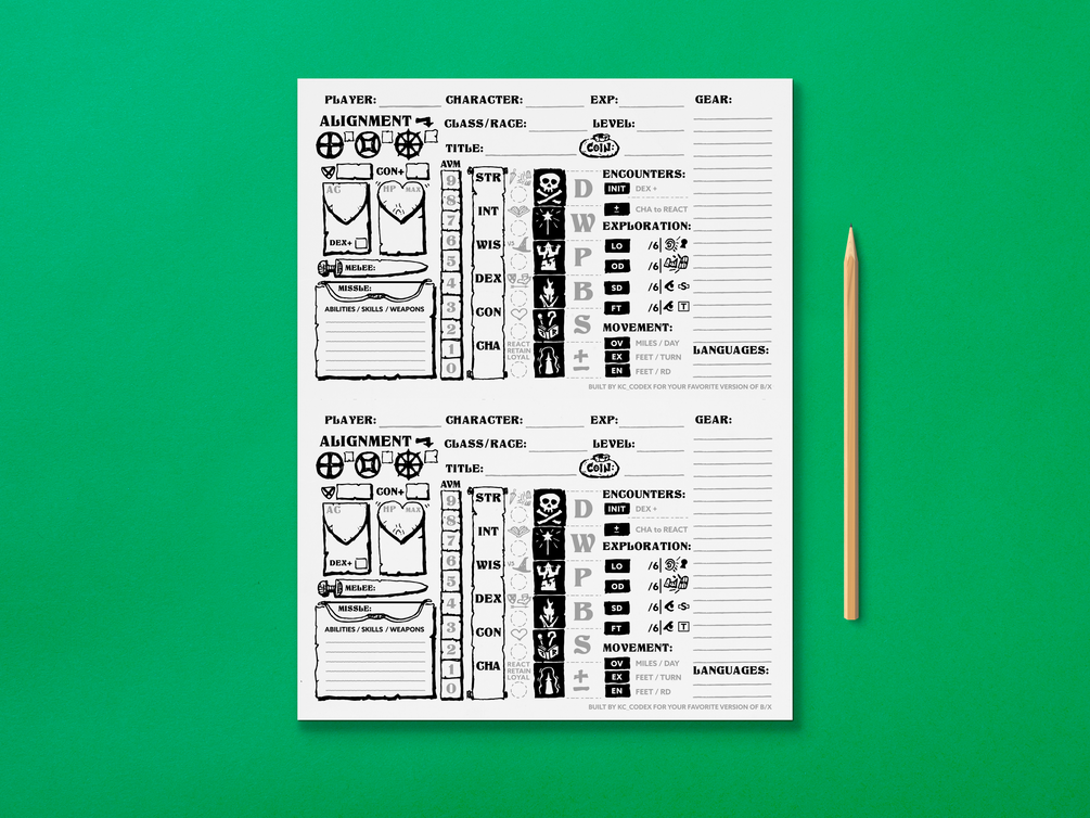 A rad B/X style character sheet meant for your favorite retro-clone like Old School Essentials and/or others of a similar vein. Coming with a second character space because you know your first character's probably gonna die anyway.
